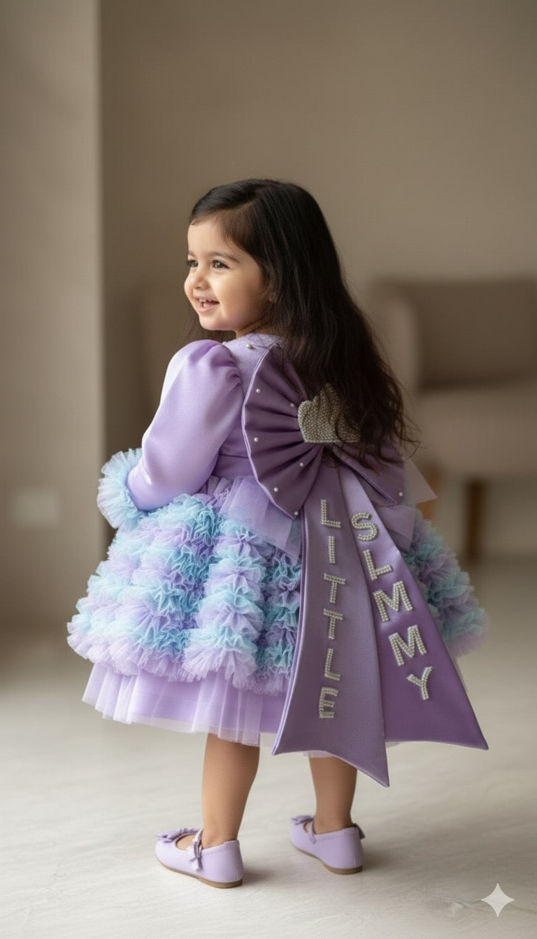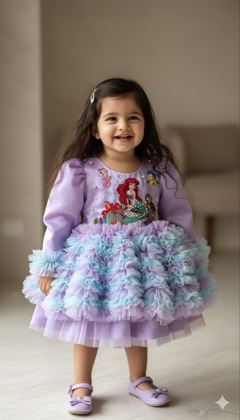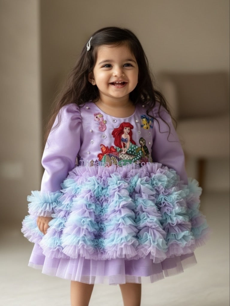 This dreamy mermaid-themed dress is designed in a soft lavender base with a statement Little Mermaid embroidered bodice. The front features a vibrant, detailed embroidery of a mermaid surrounded by her underwater friends . Pearls and tiny embellishments are scattered across the bodice, adding a magical shimmer.