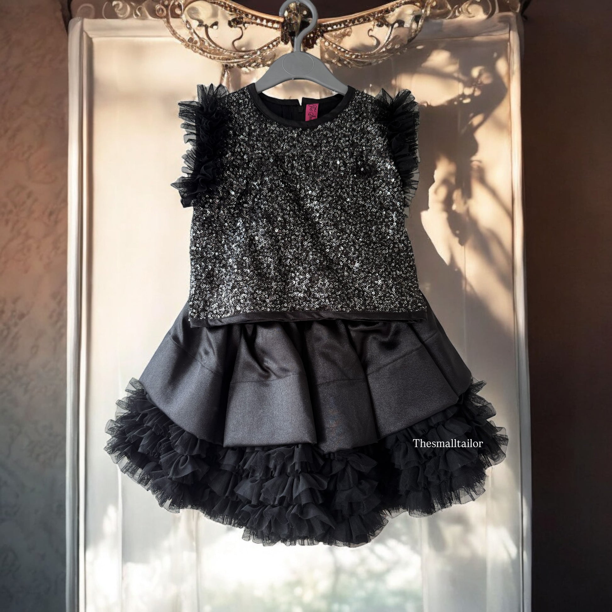 This refined sequence top and flat black Saturn skirt set combines elegance and comfort, crafted from soft fabrics with a pre-washed cotton lining for a gentle feel. Perfect for birthdays, weddings, or family gatherings, it offers versatile styling for various occasions. A timeless choice that elevates her wardrobe with effortless sophistication.